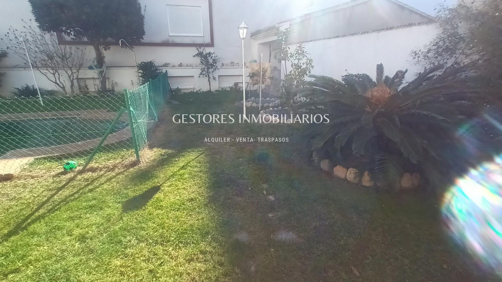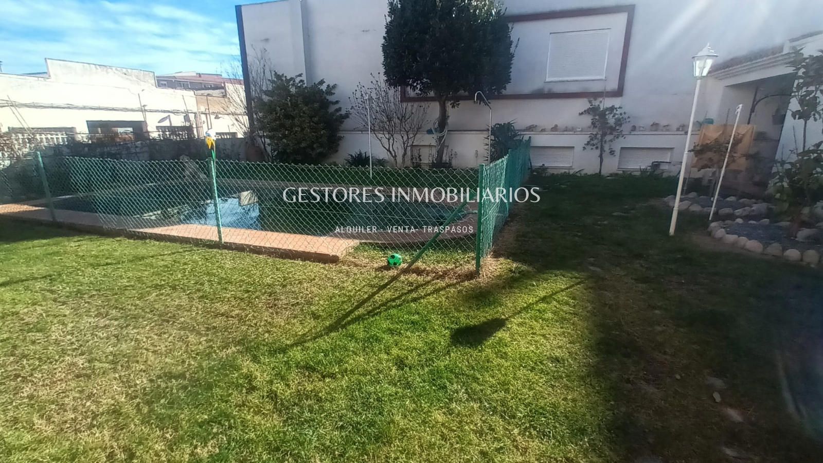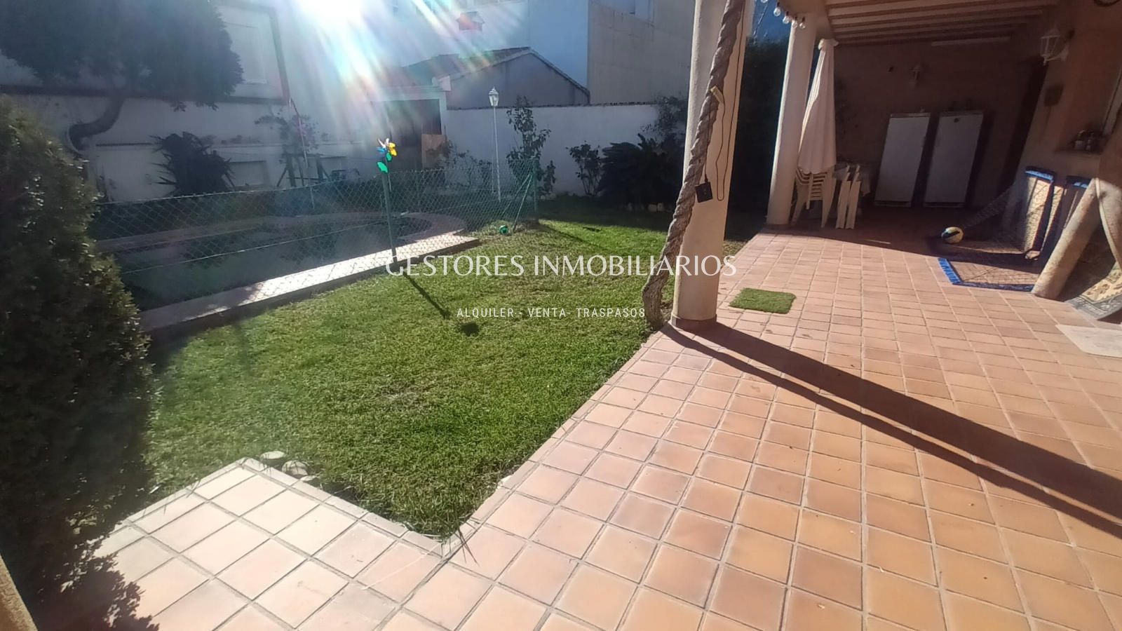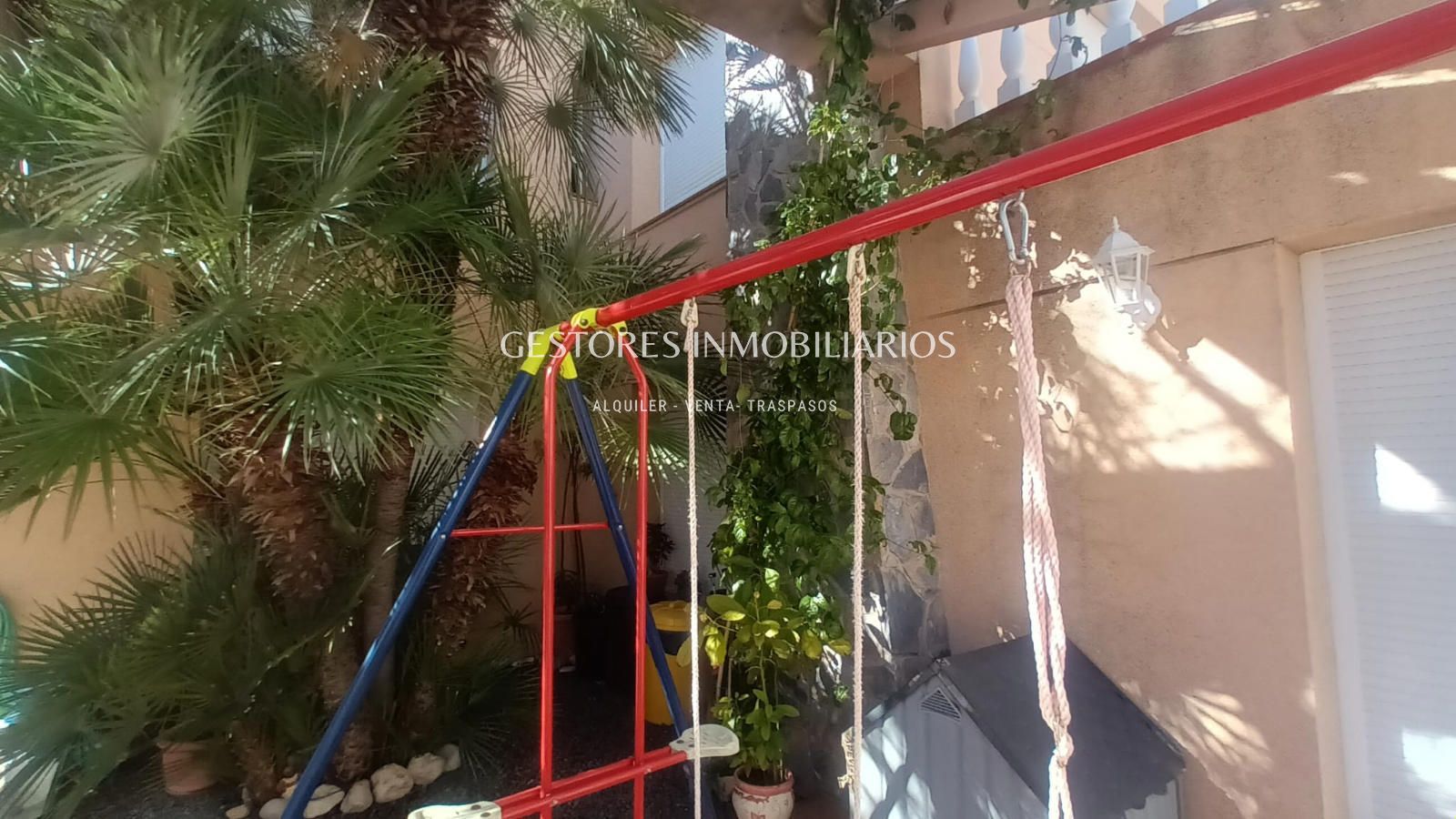 En el jardín todo iluminado por farolas de pie cuenta con piscina, zona de barbacoa donde se encuentra el pozo de agua particular ( tiene instalación por toda la casa) y un vestuario con duchas donde cambiarse después de un buen baño en la piscina. Y también parque infantil con columpios. Tiene mucha vegetación ya que cuenta con palmeras, un árbol trepador de Kiwis que en verano da sombra a la casa además de frutos y uno de Maracuyá.