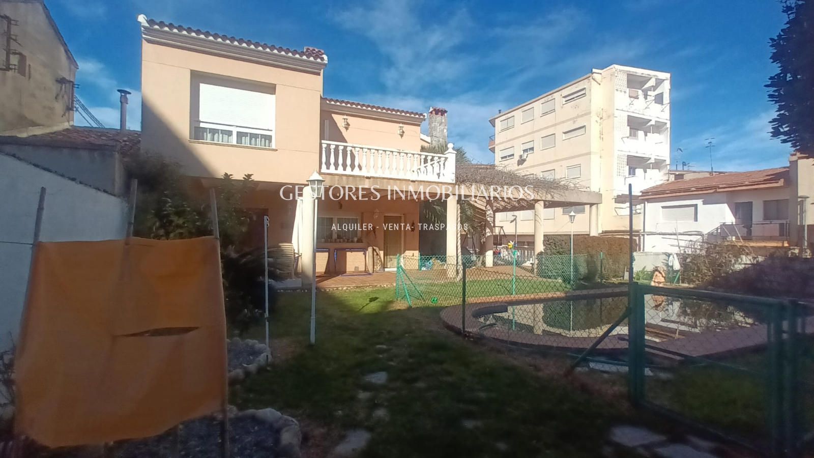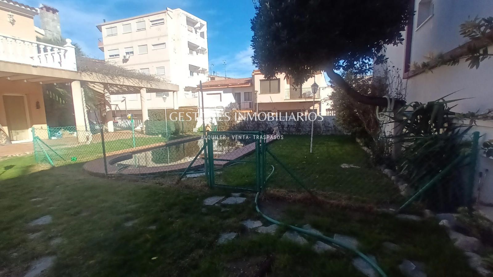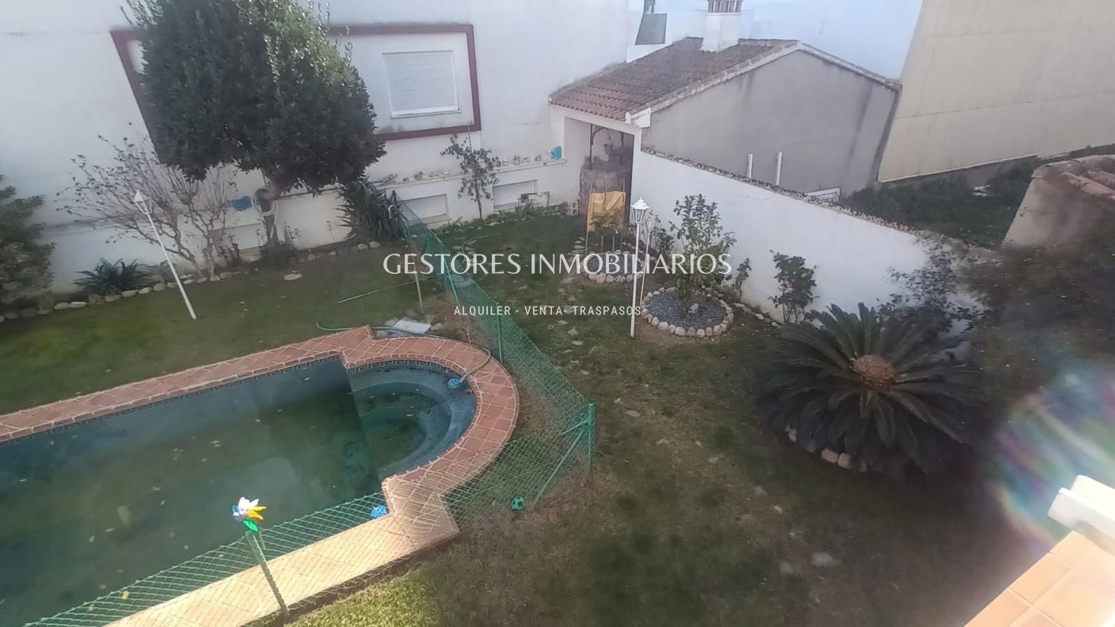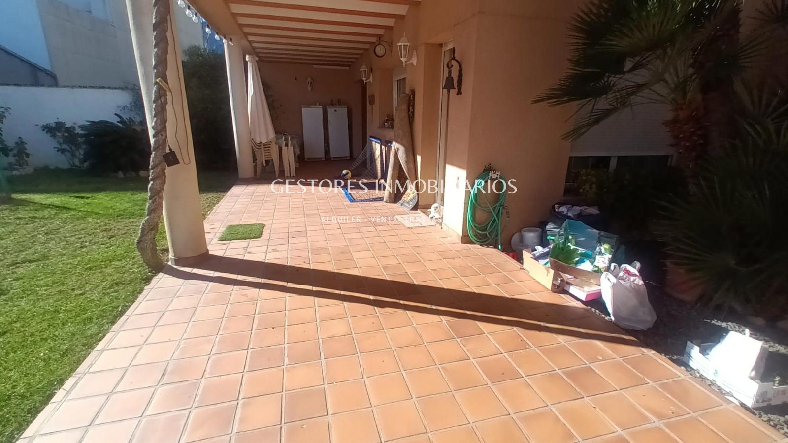 En el jardín todo iluminado por farolas de pie cuenta con piscina, zona de barbacoa donde se encuentra el pozo de agua particular ( tiene instalación por toda la casa) y un vestuario con duchas donde cambiarse después de un buen baño en la piscina. Y también parque infantil con columpios. Tiene mucha vegetación ya que cuenta con palmeras, un árbol trepador de Kiwis que en verano da sombra a la casa además de frutos y uno de Maracuyá.